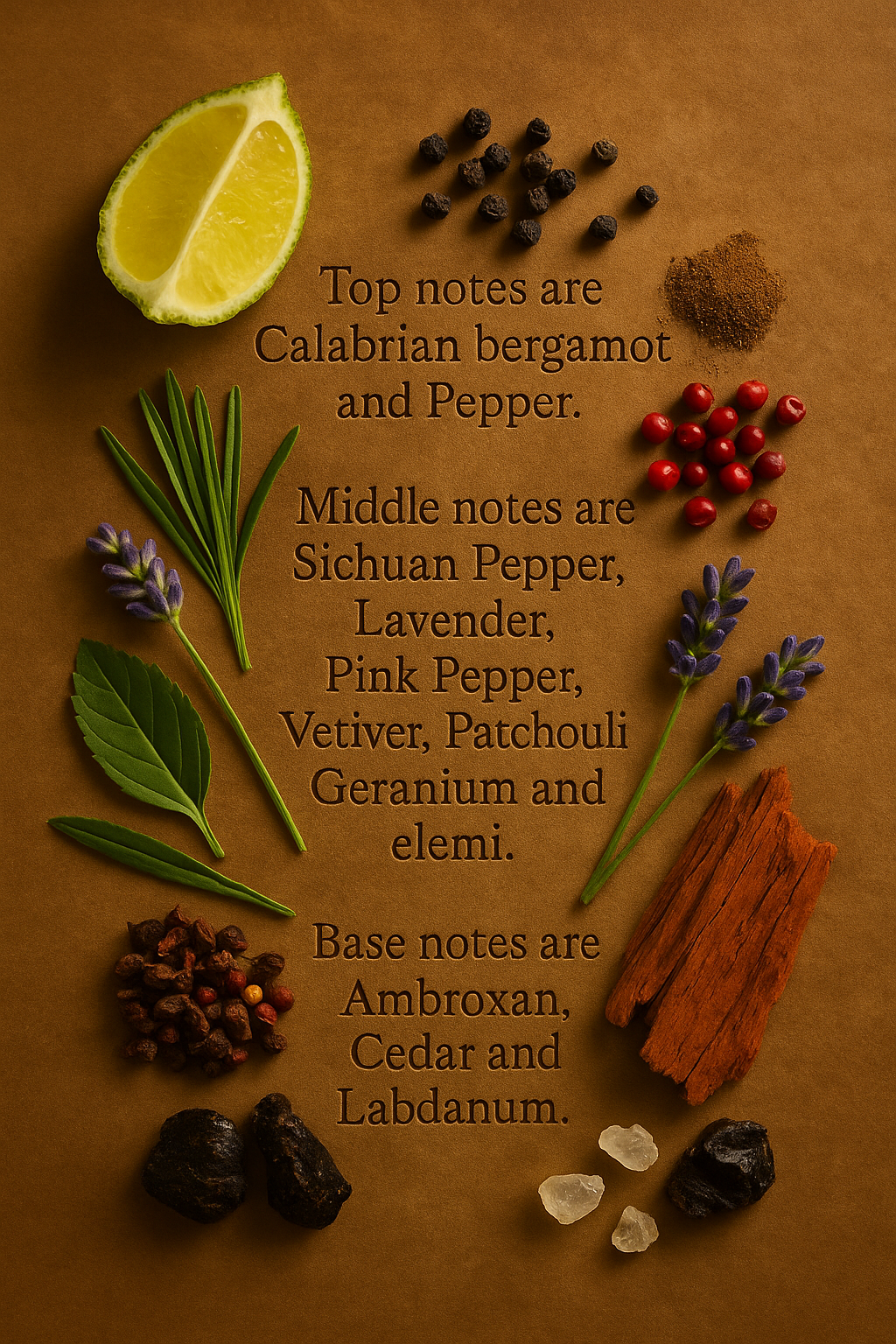 • Heart: Sichuan Pepper, Lavender, Pink Pepper, Vetiver, Patchouli, Geranium, Elemi